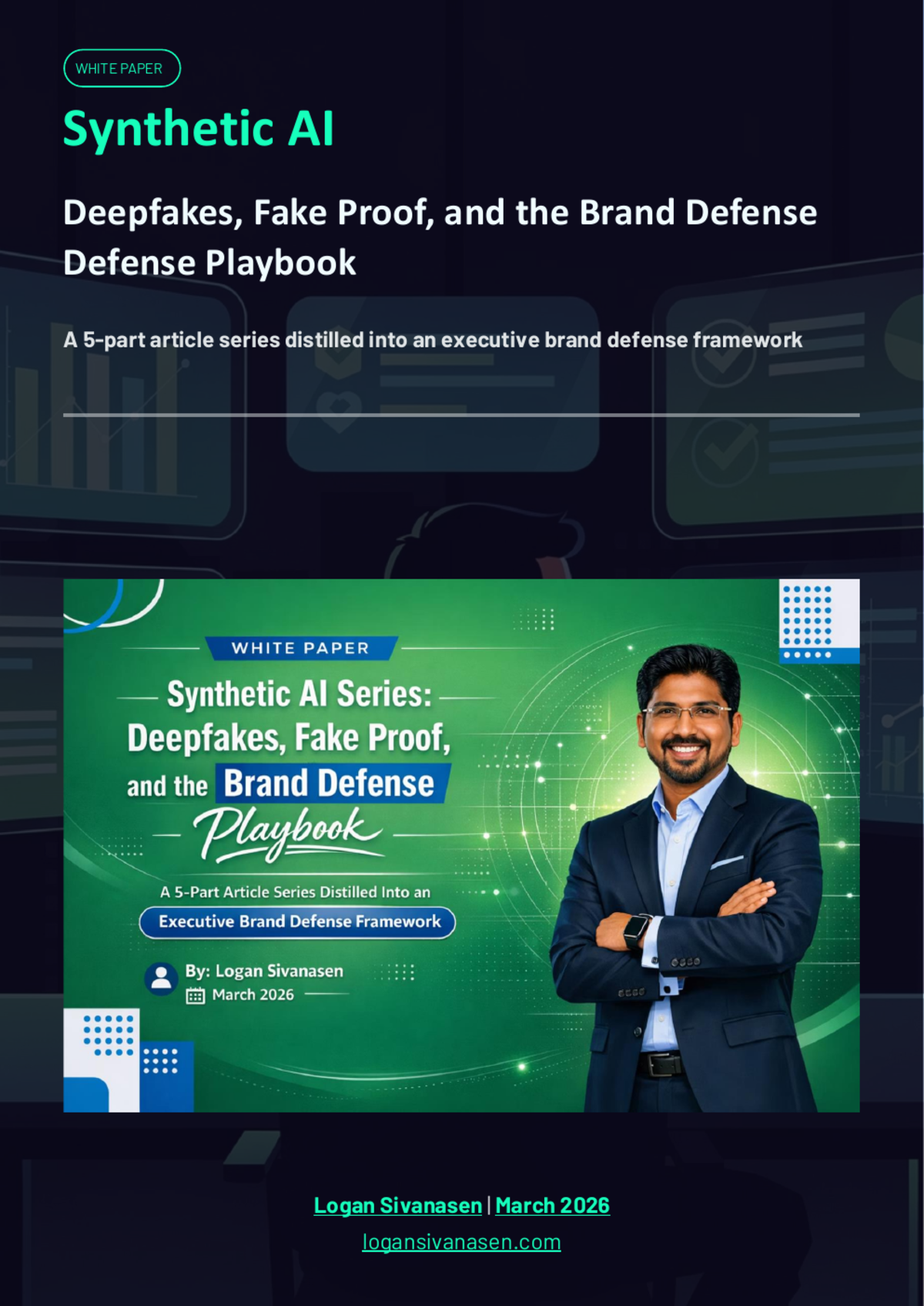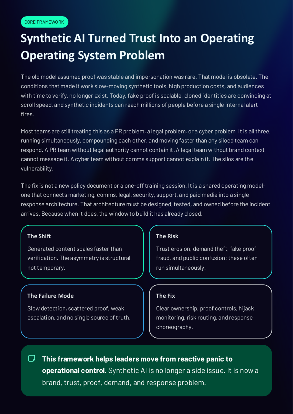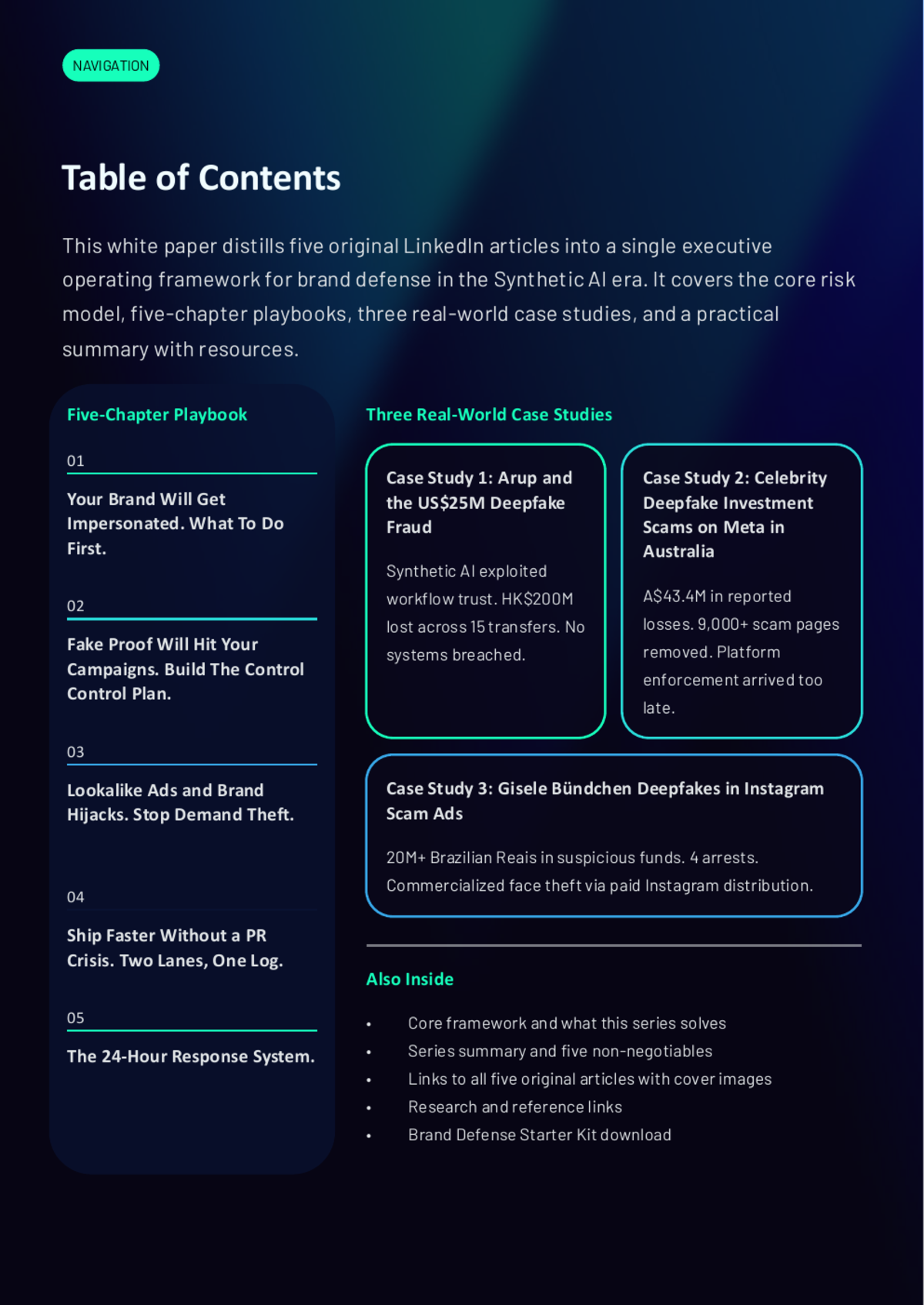 A 16-page white paper consolidating a five-part article series on how synthetic AI has changed brand defense. Covers impersonation as operational risk, proof governance, brand hijack control loops, speed-vs-safety routing, and the 24-hour response system. Includes three real-world case studies.