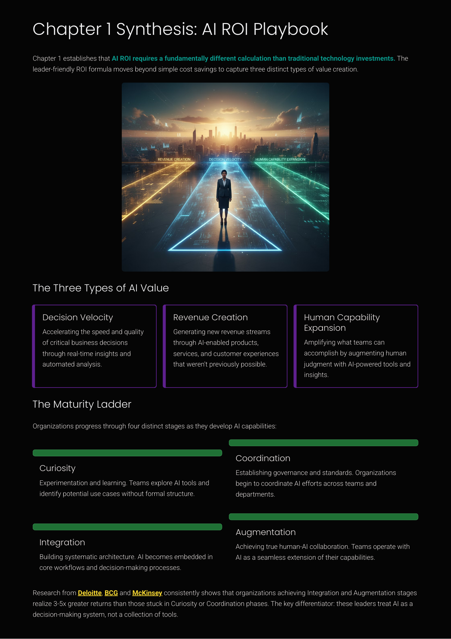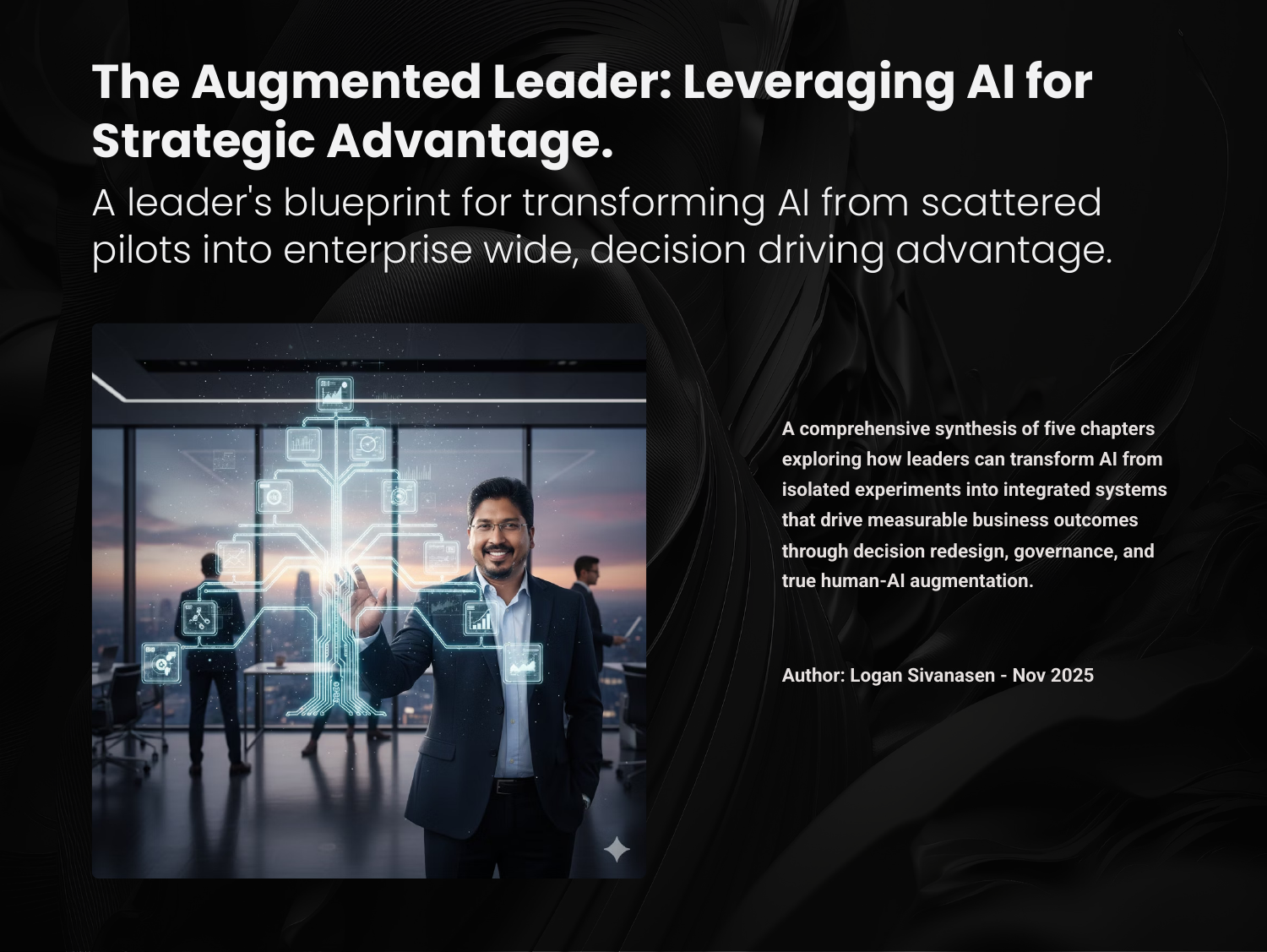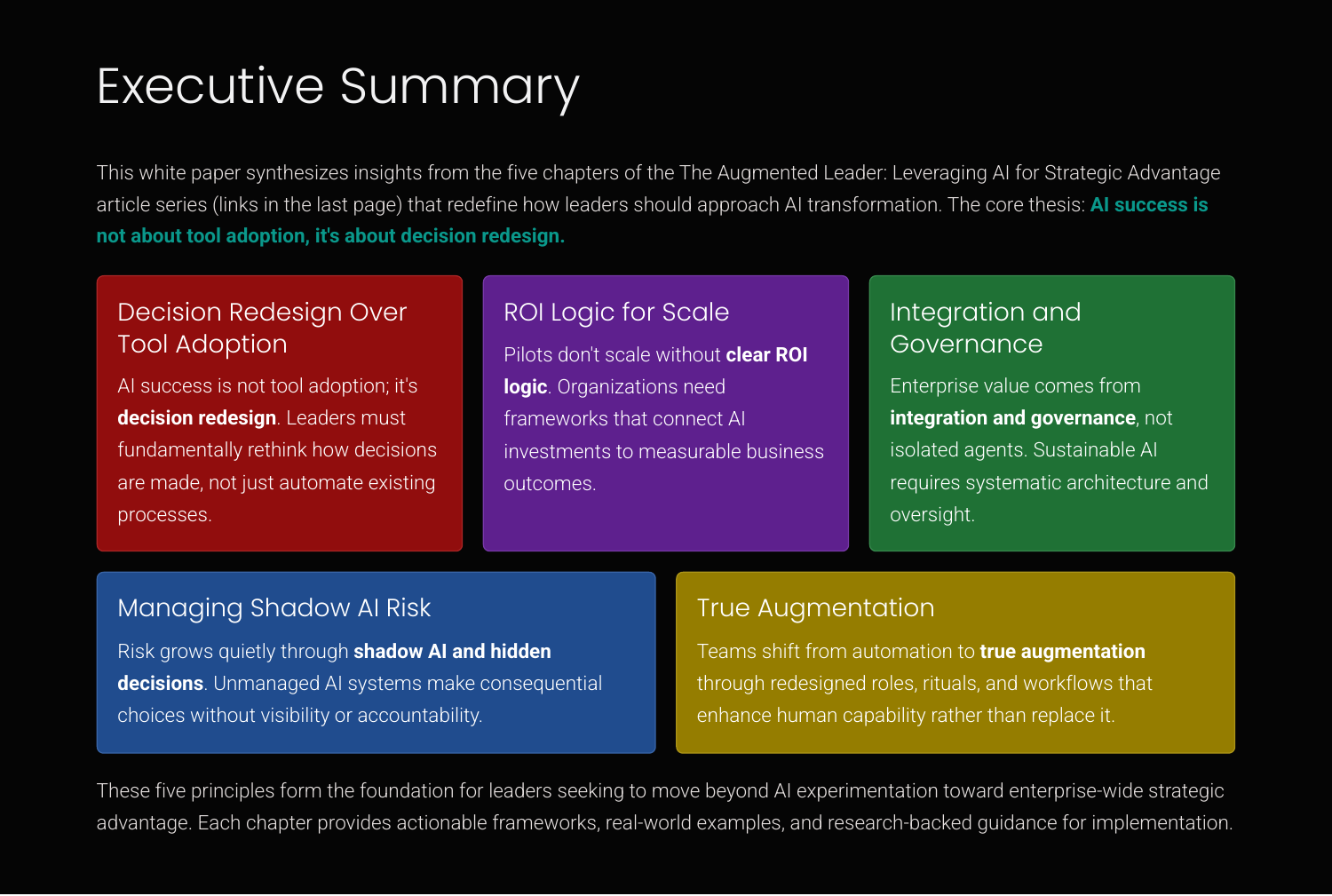 A leader's blueprint for transforming AI from scattered pilots into enterprise-wide, decision-driving advantage. A comprehensive synthesis of five chapters exploring how leaders can transform AI from isolated experiments into integrated systems that drive measurable business outcomes through decision redesign, governance, and true human-AI augmentation. Informed by McKinsey↗, Gartner↗, and Harvard Business Review↗ research on AI leadership and organizational transformation.